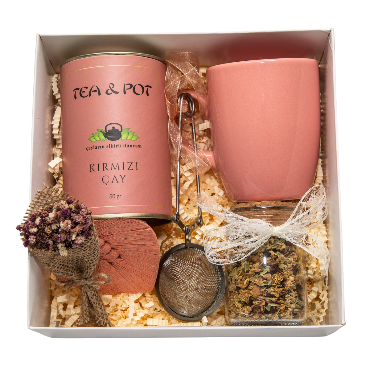 İçerisinde 50 gr Zindelik Çayı, 25 gr Kış Çayı, bir adet kupa, bir adet maşalı çay süzgüsü, sete ilave olarak makrome anahtarlık ve süs kuru çiçek bulunmaktadır.