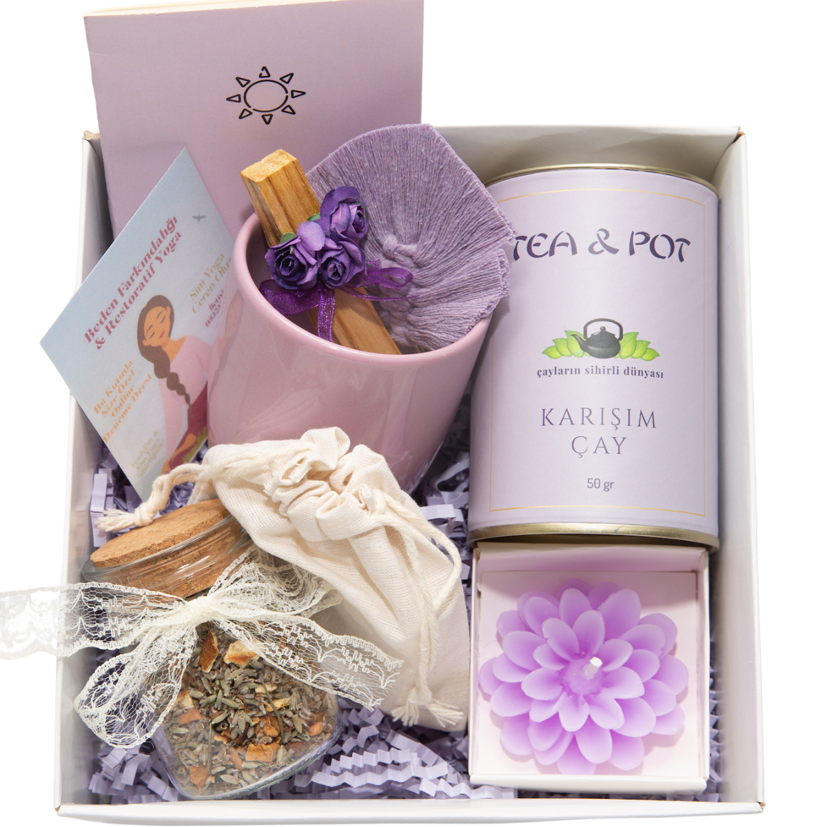 Bu kutumuzu hazırlarken renkleri ve çay çeşitlerimizi özenle seçtik. Setimizde 50 gr Ayurvedik Çay, 25 gr Lavanta&Limon Çayı, mor lotus mum, palo santo tütsü, bir adet kupa, çay demleme filtresi, sete ilave olarak makrome anahtarlık ve huzurlu notlarınız için küçük boy bir defter bulunmaktadır.